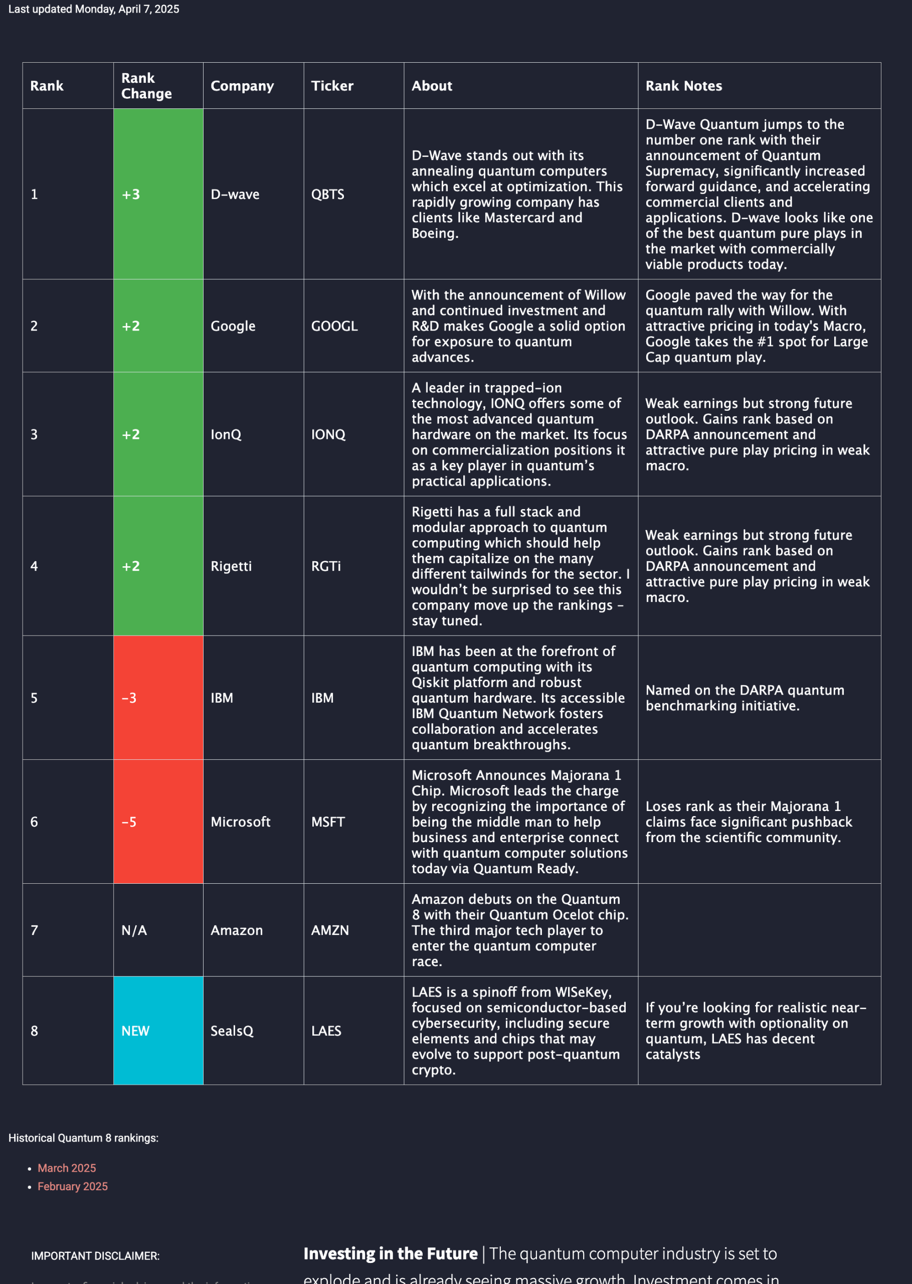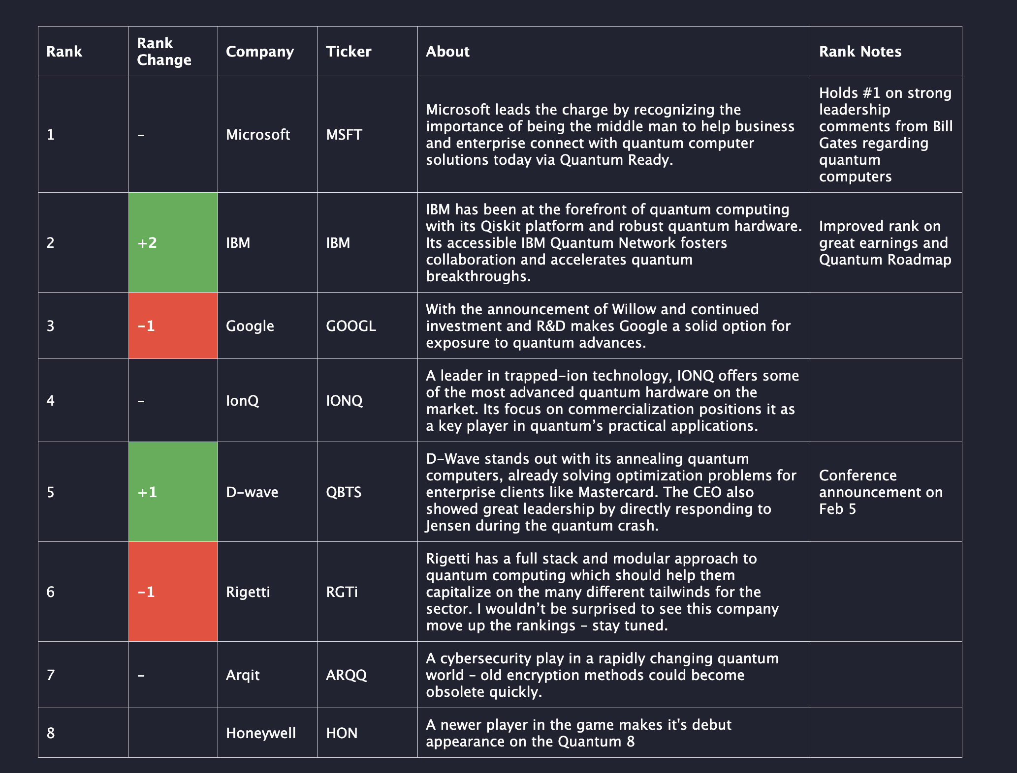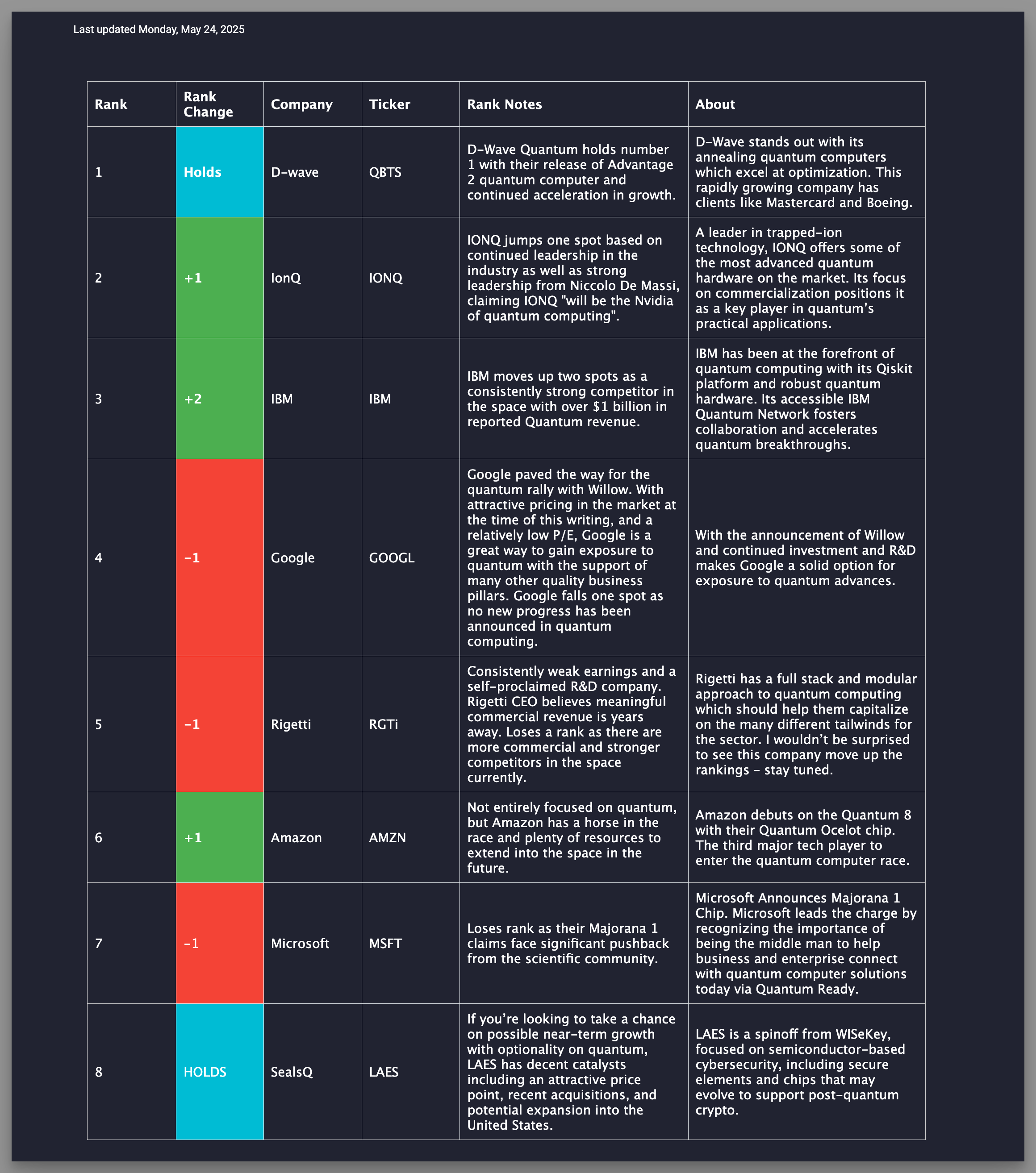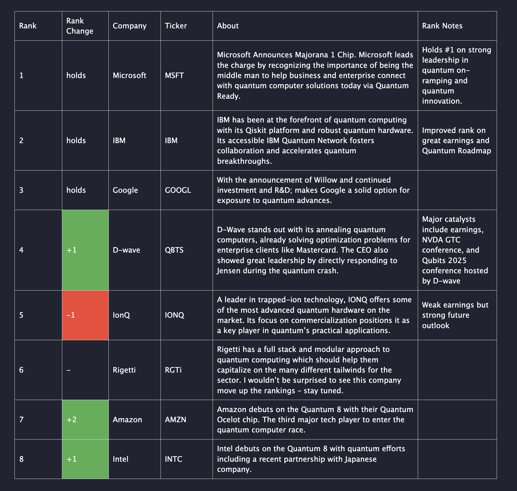 4 | -1 | D-wave | QBTS | D-Wave produced a lackluster QoQ earnings and has not reported news of significance since it's hot start to 2025. While D-wave excels in the Public Relations game, research, system sales and customer acquisitions will be the true long-term measure of success. Early 2025 momentum appears to be waning, at least for now. | D-Wave stands out with its annealing quantum computers which excel at optimization. This rapidly growing company has clients like Mastercard and Boeing. |
