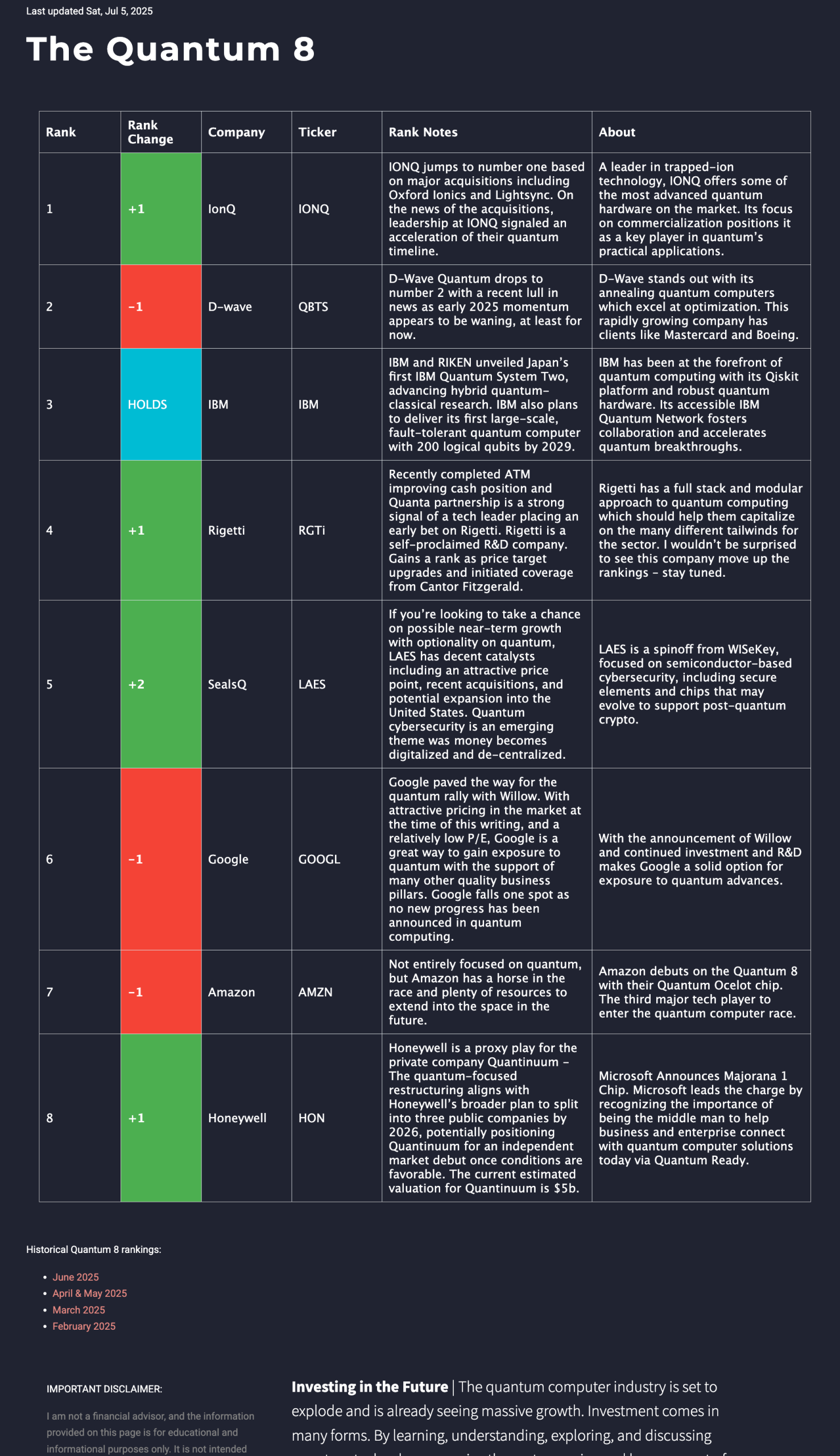 3 | +1 | Rigetti | RGTi | Rigetti successfully launched its 36-qubit system on August 15, and remains on track to release its 100+ qubit chiplet-based system at 99.5% median two-qubit gate fidelity before the end of 2025. Recently completed ATM improving cash position and Quanta partnership is a strong signal of a tech leader placing an early bet on Rigetti. Rigetti is a self-proclaimed R&D company. Gains a rank delivering on hardware without the marketing fluff. | Rigetti has a full stack and modular approach to quantum computing which should help them capitalize on the many different tailwinds for the sector. I wouldn’t be surprised to see this company move up the rankings – stay tuned. |