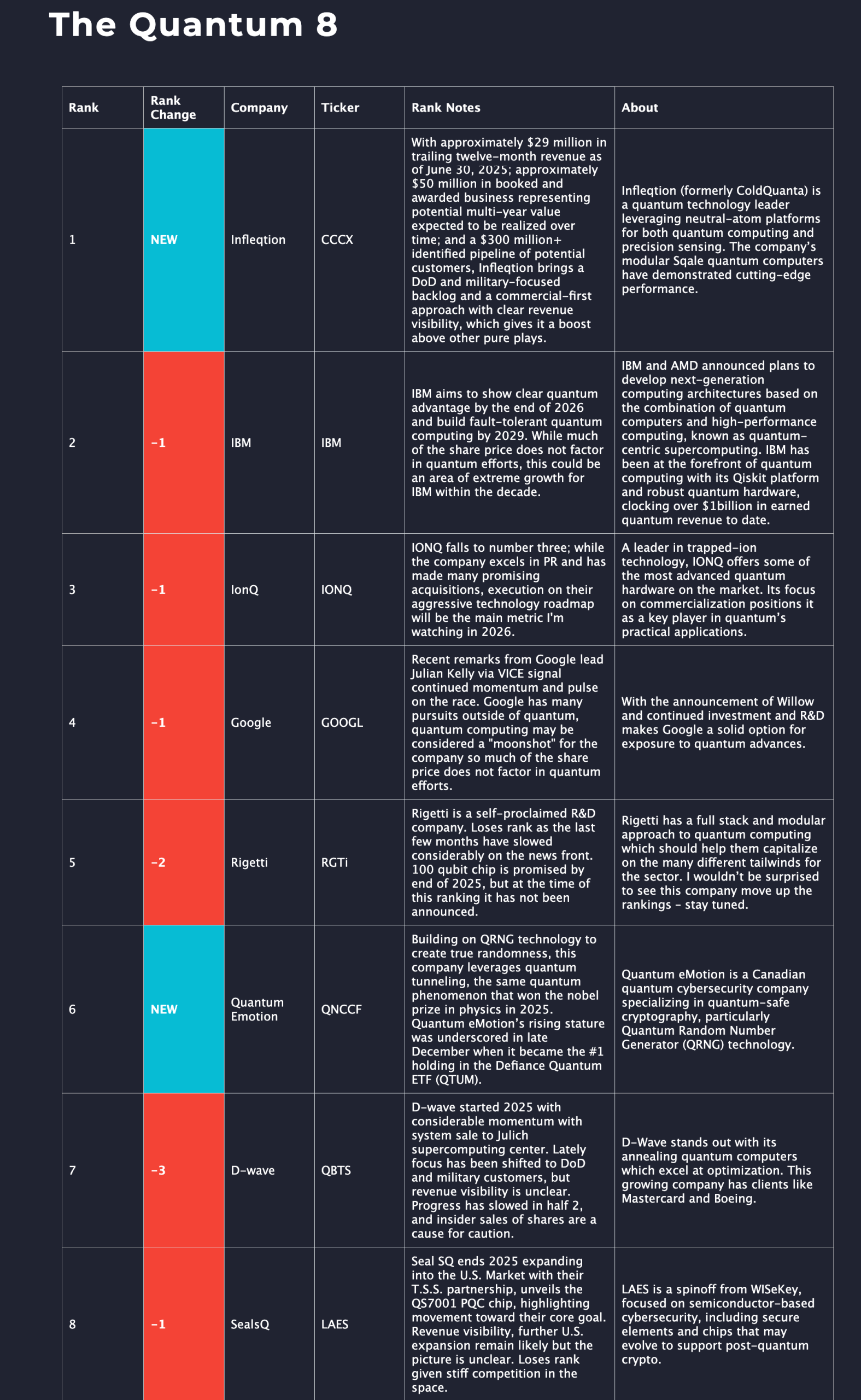 | 2 | -1 | Infleqtion | INFQ | From impressive collaborations with NASA to responsible spending. Infleqtion said it expects $40 million in 2026 revenue, up from $32.5 million in 2025, citing growing demand for its quantum sensing and computing products. The update also reinforces commercial momentum through recent wins in precision timing, a 100-qubit UK system delivery, new ARPA-E funding, and more than $20 million in contracted NASA Pathfinder funding to date. Loses one rank as currently competitors in the space will likely grow revenue more quickly. | Infleqtion (formerly ColdQuanta) is a quantum technology leader leveraging neutral-atom platforms for both quantum computing and precision sensing. The company’s modular Sqale quantum computers have demonstrated cutting-edge performance. |