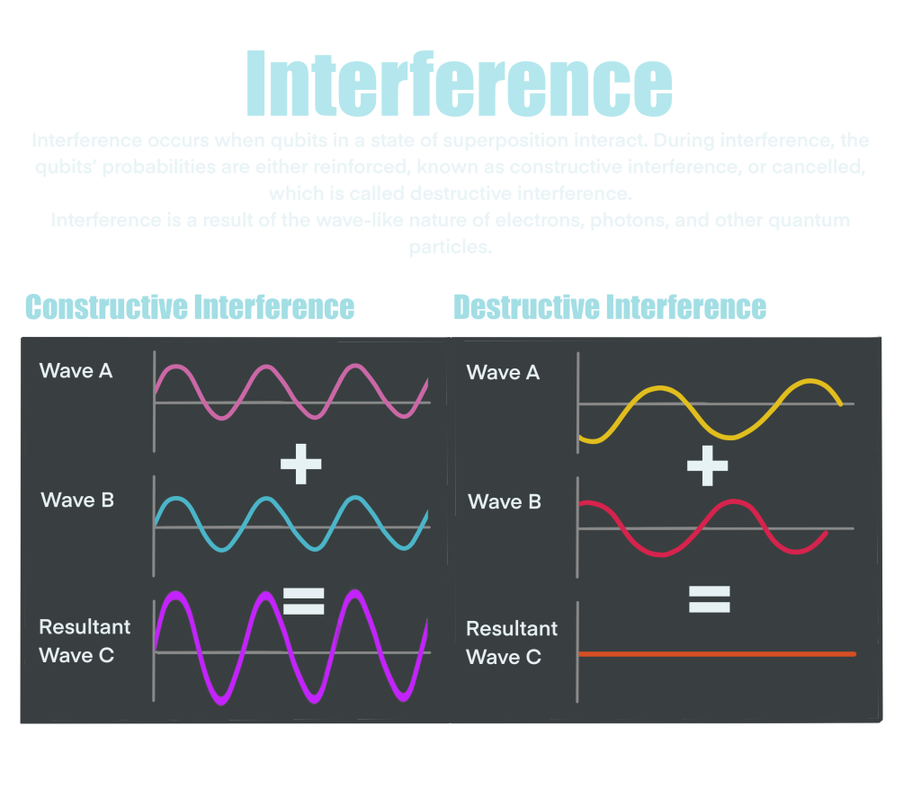 Interference, on the other hand, is a quantum property that quantum computers harness to solve problems. By carefully manipulating wave-like quantum states, constructive interference amplifies the right solutions, while deconstructive interference cancels out two out-of-phase waves, resulting in a flat wave. This reduces the likelihood of an incorrect output.