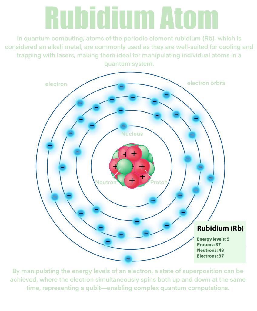 Atoms like rubidium, cesium, ytterbium, and strontium are commonly used because of their specific energy levels and quantum properties. These atoms enable the creation and manipulation of qubits due to their ability to maintain coherence and interact predictably in quantum systems.